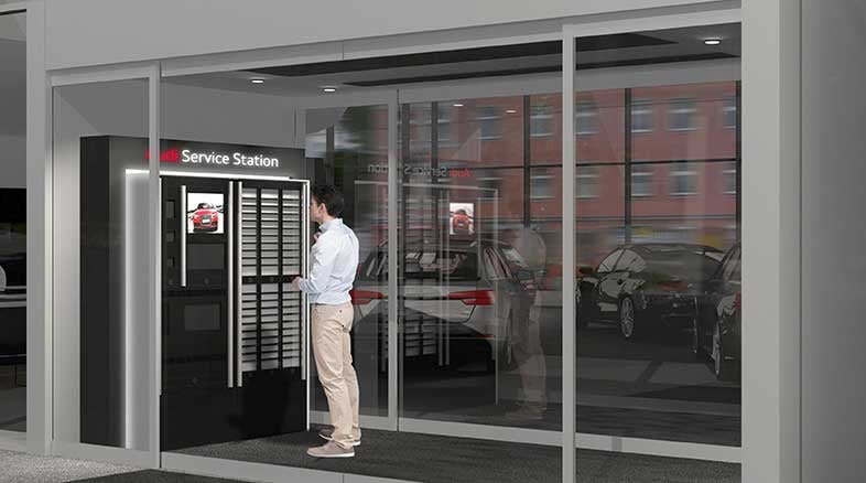 Après une prise de rendez-vous avec la concession Audi Roissy Charles de Gaulle, une place de stationnement lui sera réservée ainsi qu’un code d’accès. Une fois arrivé, le client se rend à la borne Audi Service Station, s’ identifie et y dépose ses clefs dans un casier sécurisé. Un lecteur digital aura auparavant scanné l’ensemble des informations du véhicule stockées dans les clefs.