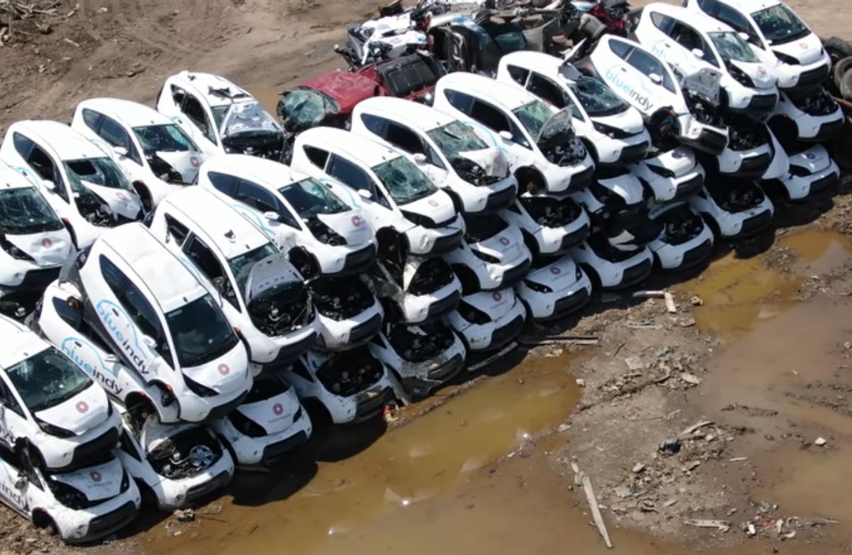 Issues du dispositif d’autopartage BlueIndy, désormais arrêté, ces dizaines de Bluecar n’ont à priori pas été détruites sans raison.