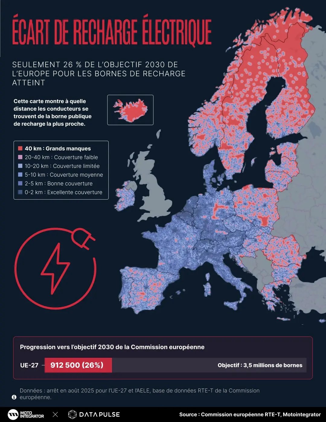 L’Europe accuse un retard considérable dans le déploiement de son infrastructure de recharge pour véhicules électriques. Selon une analyse récente portant sur près d’un million de points de recharge, l’Union européenne n’a atteint à date que 26 % de son objectif fixé pour 2030.
