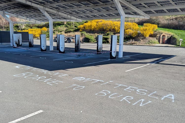 Tesla Takedown : le mouvement anti-Musk va-t-il gagner la France ce samedi 29 mars ?Et pourtant, c’est sur ce parking de supermarché, où les seules incivilités se limitent à quelques rodéos urbains la nuit tombée, qu’une station flambant neuve a entièrement été calcinée. Toutes les stèles ont été endommagées, dont deux totalement détruites, et devront donc être remplacées. L’objectif de cet acte est sans équivoque, comme le laisse penser la signature posée au sol : « Campagne Anti Tesla, Borne to burn ». C’est que ces contestataires (en un mot) auraient même le sens du jeu de mots.