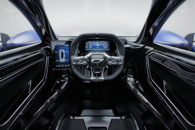 Dans le dos des deux passagers, installés en tandem comme dans une Renault Twizy, se trouve un V8 2,88 litres biturbo. L’unité thermique, capable d’aller chercher les 11 000 tr/min, est associée à deux moteurs électriques posés sur le train avant, eux-mêmes alimentés par une batterie au lithium-titanate. La fiche technique annonce une puissance totale de 1 250 ch, qui lui permet de viser une vitesse de pointe de 432 km/h et un 0-100 km/h en 1,9 seconde.