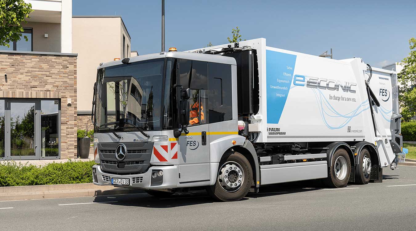 Caractérisé par sa cabine basse et principalement destiné aux collectivités, notamment pour la collecte de déchets, le nouveau Mercedes eEconic reprend la même base technique que l’eActros.
