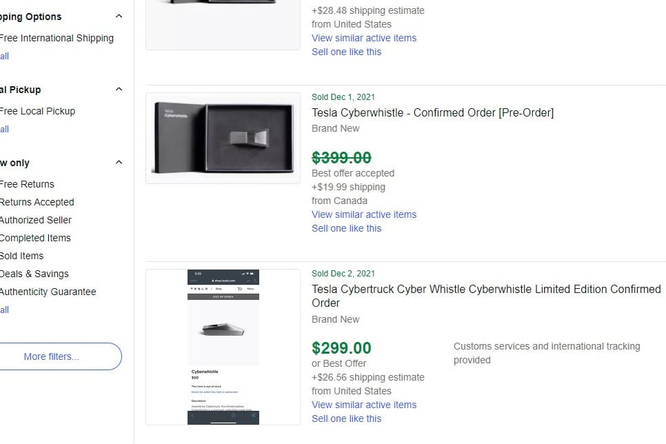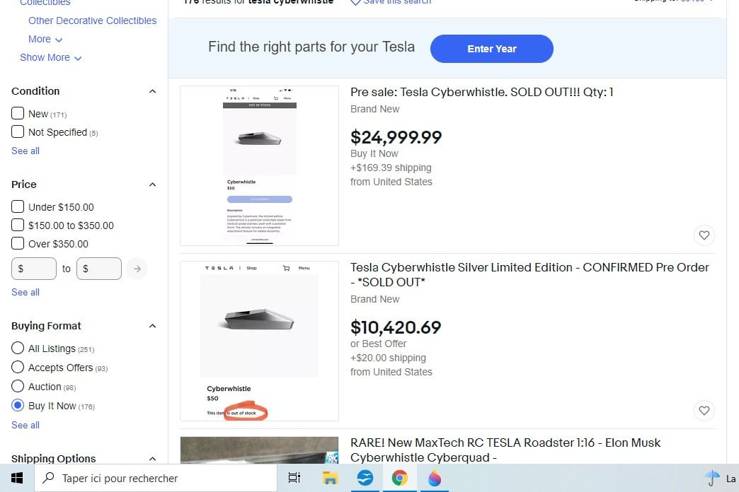 À ce prix-là, les Tesla Cyberwhistle n’ont pas encore trouvé preneurs. En revanche, de nombreux vendeurs ont déjà pu écouler leur sifflet : alors que les premiers exemplaires sont partis autour des 200 $, les dernières ventes se négocient entre 300 $ et 400 $.
