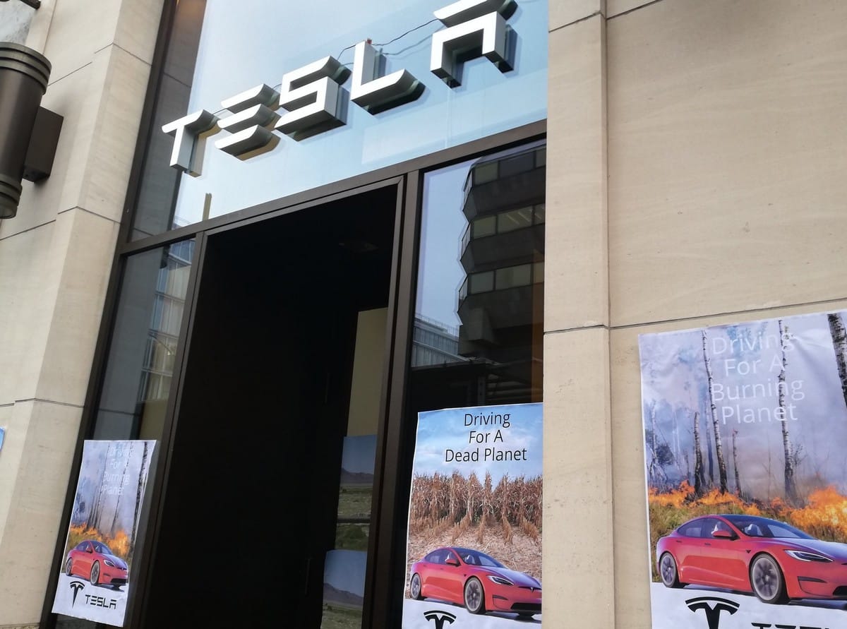 Des posters ont été collés sur les murs, dont un reprenant le slogan « Driving for a Dead Planet », soit « conduire pour une planète morte ». Le logo de la marque a aussi reçu de la peinture, ce qui ne représente aucune dégradation durable. Les militants souhaitent que l’Allemagne soutienne financièrement les transports publics, plutôt que l’entreprise américaine.