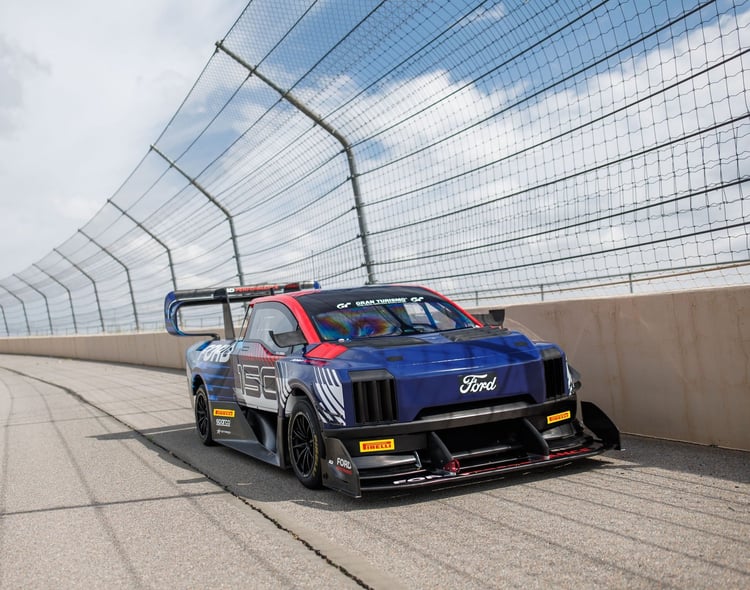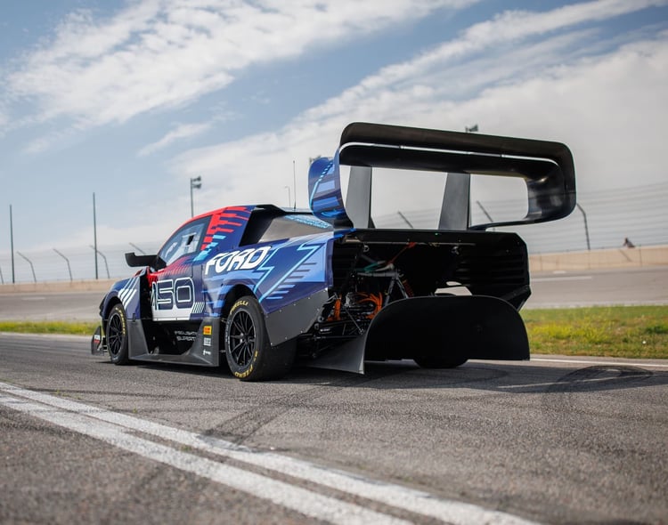 C’est ainsi qu’elle présente le F-150 Lightning SuperTruck, avec une silhouette de pick-up. Attention, il n’y a bien ici qu’une silhouette, puisque l’engin reçoit lui aussi un kit aéro extrême.