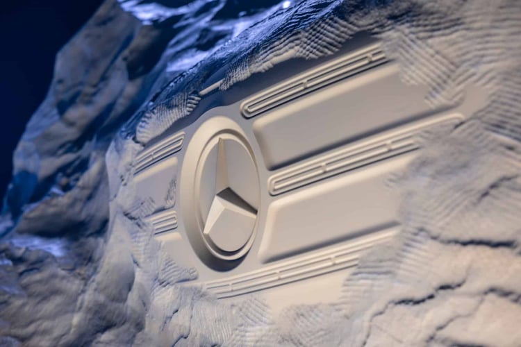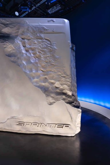 Mercedes VLE : le futur grand monospace électrique montre de quoi il est capableEn ouverture des célébrations de ce 130ᵉ anniversaire, le nouveau Sprinter a commencé à se dévoiler, via une sculpture aux dimensions impressionnantes : 650 cm de long, 275 cm de haut et 250 cm de large. De ce bloc émergent quelques détails du style de ce nouveau fourgon avec un capot plus sculpté, en ligne avec ce qui a déjà été montré des petits frères VLE/VLS/Vito.