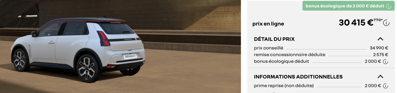 A cela peut s’ajouter une prime reprise de 2.000 €, que l’on vous conseille de négocier bien sûr même sans reprise. Ce qui donne un coup de pouce de 4.575 € sur ce véhicule. On n’oublie pas le bonus, de 2.000 à 4.000 € selon les revenus. En prenant tout en compte, cette R5 peut s’afficher à 26.415 €.