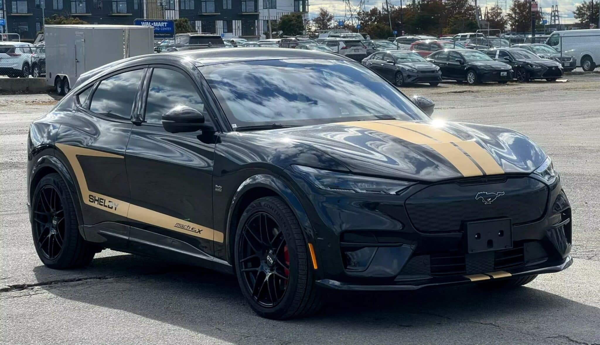 Dans sa flotte de voitures électriques, Hertz proposait une version spéciale du Ford Mustang Mach-E. Noir avec des bandes dorées pour rappeler les couleurs du loueur, il avait aussi un badge Shelby.