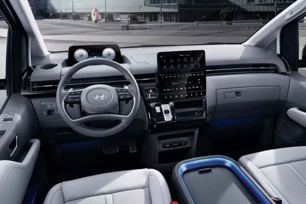 On y remarque aussi la trappe de recharge située à l’avant, comme sur le Hyundai ST1, l’utilitaire 100 % électrique dérivé du Staria. Si la fiche technique de ce Staria électrique est encore inconnue, il devrait sans aucun doute adopter la chaîne de traction de l’utilitaire.