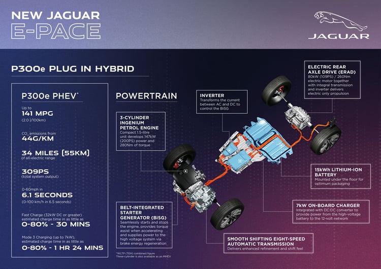 Le SUV E-Pace profite de sa mise à jour de mi-carrière pour adopter une nouvelle version hybride rechargeable P300e, rejoignant le récent F-Pace P400e au catalogue Jaguar.