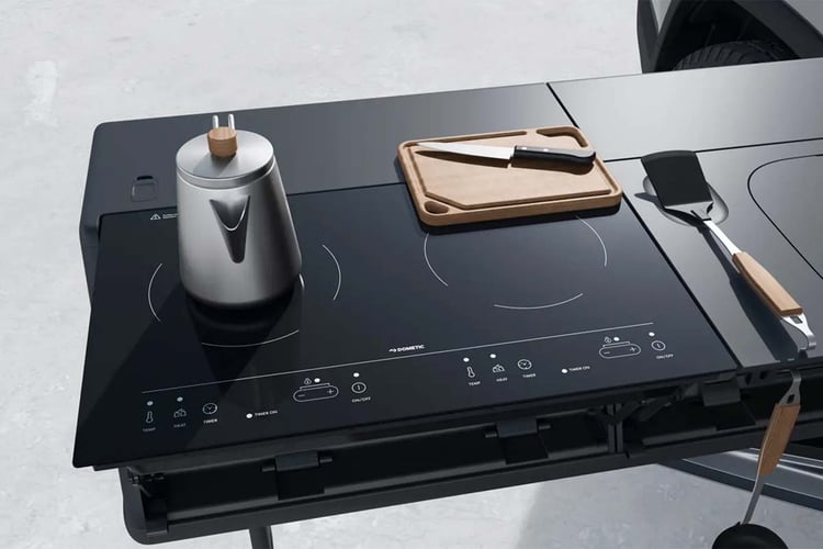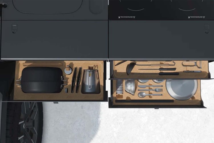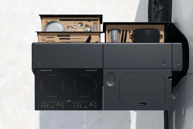 La nouvelle itération de cette cuisine ne change pas vraiment de la première version dévoilée en amont de la production du R1T. Elle reçoit toutefois un nouveau système de rail et un inédit set de vaisselle et couverts Snow Peak. En outre, quelques ustensiles ont été, à peine, retouchés pour plus de praticité à l’usage.