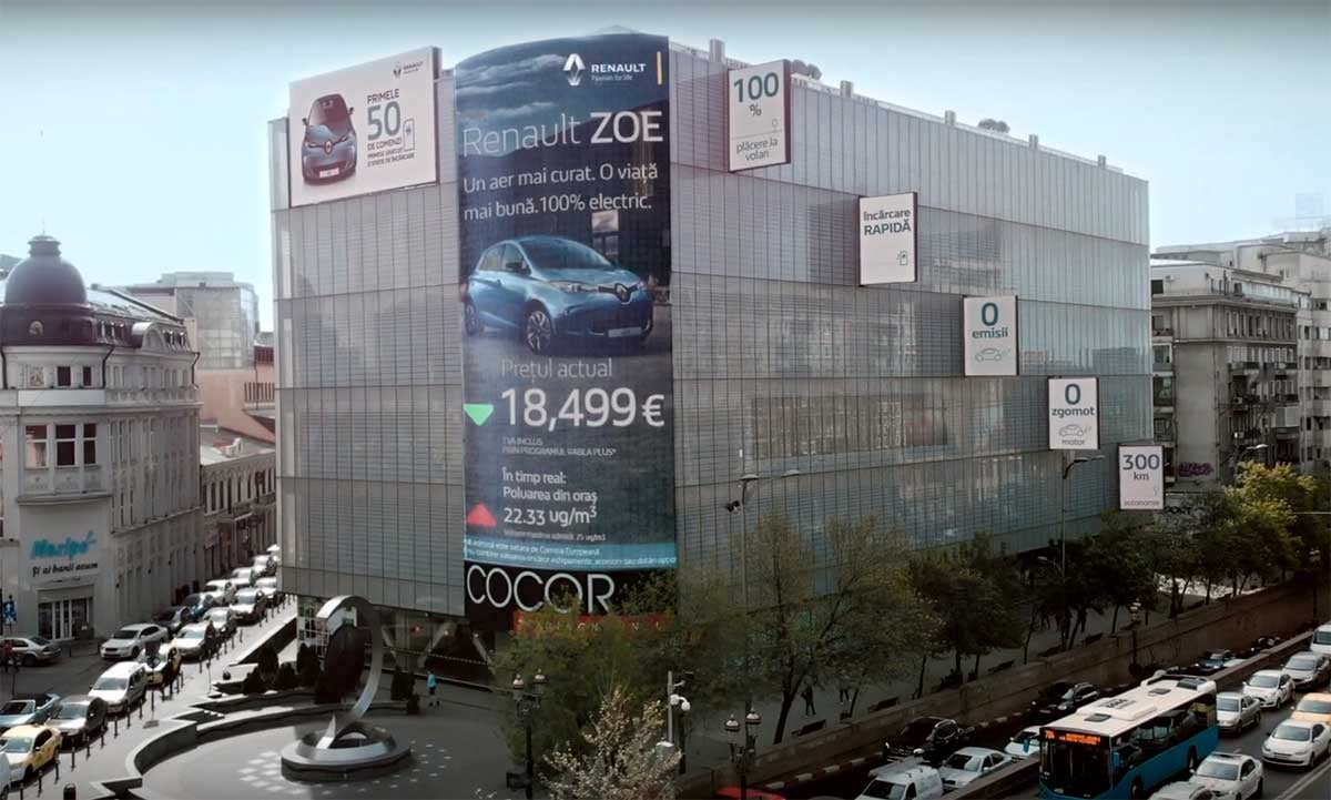 Indexer le prix de la Renault ZOE sur le taux de particules. L’idée est excellente mais il fallait y penser ! Installée en plein cœur de Bucarest, cette immense publicité a de quoi interpeller. Relié à un capteur – baptisé disCO2utn – qui mesure la pollution en temps réel, le panneau se met à jour toutes les six minutes. Le principe est simple : plus le niveau de pollution augmente, plus le prix de la voiture électrique de Renault diminue.