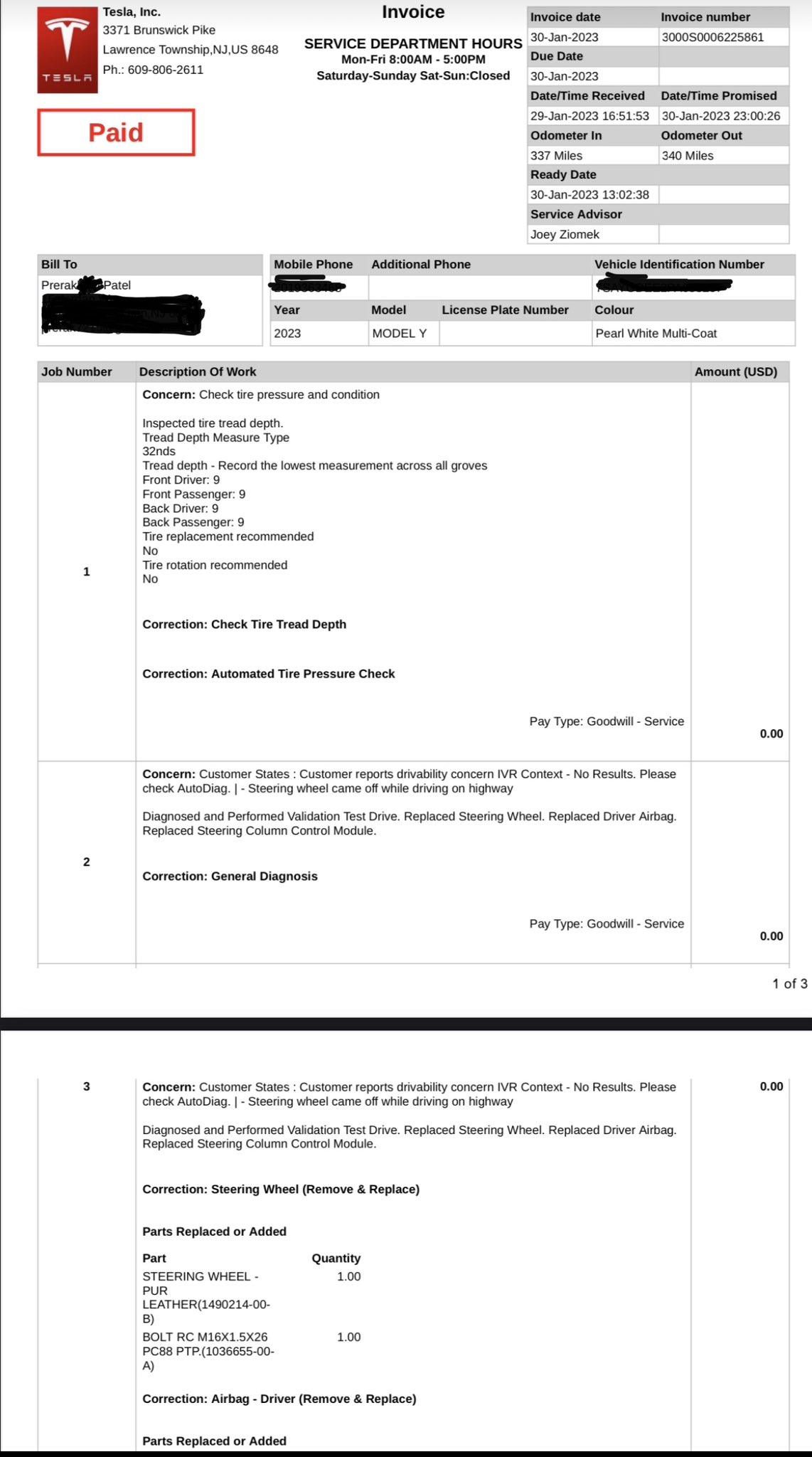 Pourtant, il apparaît bien sur la facture publiée par le propriétaire l’ajout ou le remplacement d’une vis de référence 1036655-00-A, effectivement absente de la colonne de direction sur les photos. Ce serait elle, absente ou mal fixée sur ce véhicule neuf, qui aurait causé la chute du volant. En tout état de cause, malgré l’évidence de la situation, Tesla semble placer bien bas ses seuils de tolérance, voire bien en dessous des seuils de la sécurité des occupants.