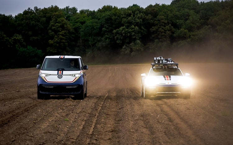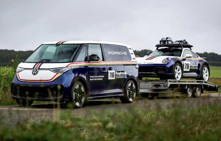 Le Volkswagen ID.Buzz a reçu une livrée spéciale rendant un hommage au rallye-raid et au Dakar. En tractant une Porsche…