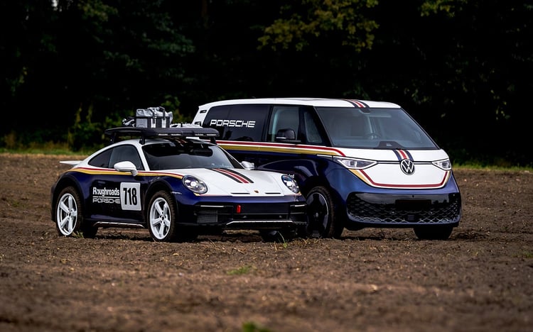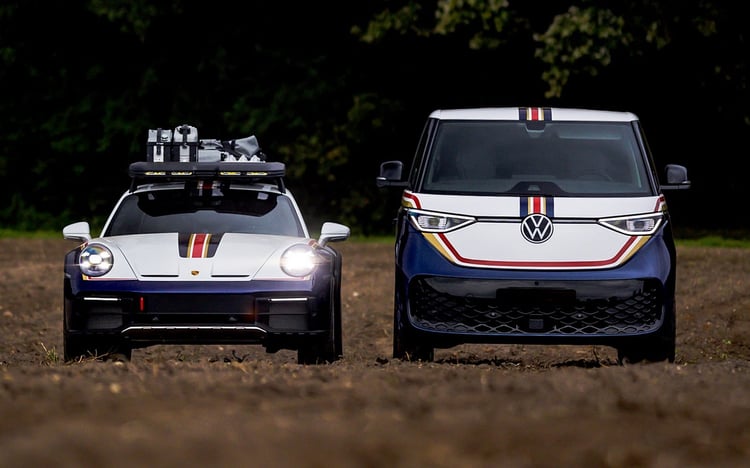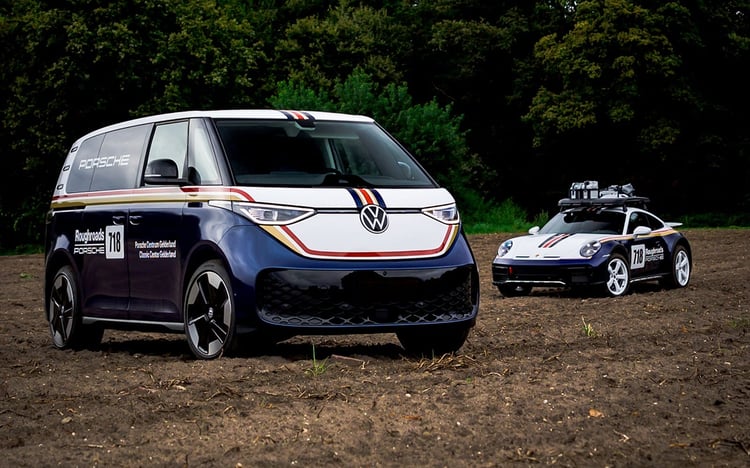 Le Volkswagen ID.Buzz a reçu une livrée spéciale rendant un hommage au rallye-raid et au Dakar. En tractant une Porsche 911 de la même décoration, les deux créent un ensemble particulièrement réussi.