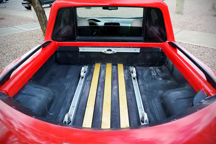 Après avoir soudé les portes arrières de cette LEAF, découpé sa carrosserie et éliminé la partie arrière de son habitacle ainsi que son coffre, les ingénieurs lui ont greffé un lit de Nissan Frontier. La paroi arrière placée au dos des sièges avants provient, elle, d’un Nissan Titan.