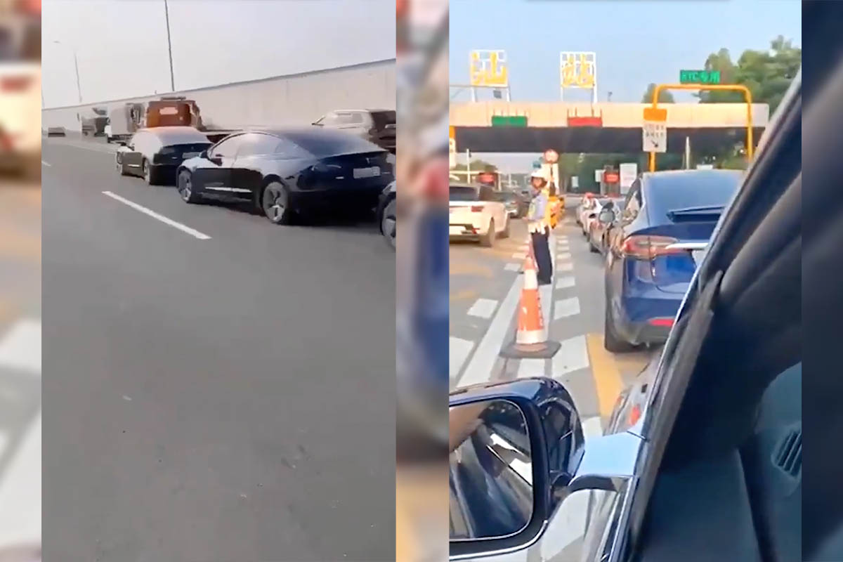 D’après plusieurs vidéos postées sur Internet, les Tesla seraient mises en quarantaine par la police pour les empêcher de rouler sur l’autoroute.