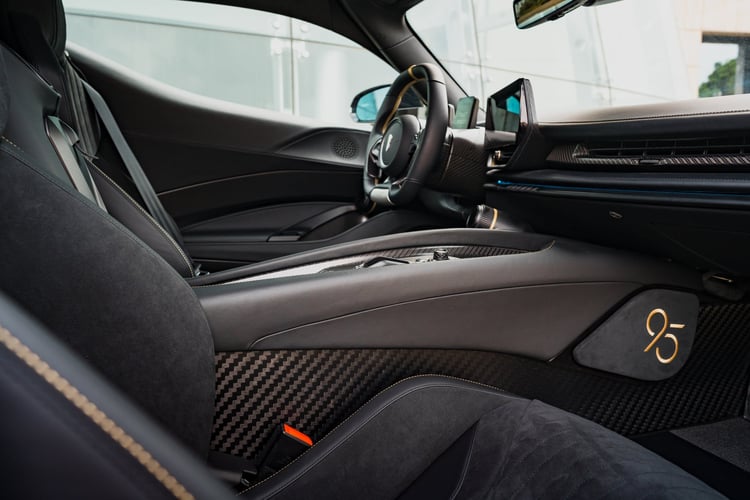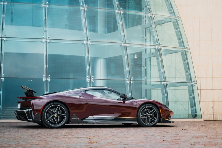 Vêtue de carbone rouge, la Battista Novantacinque s’orne de détails dorés, dont de multiples références au nombre 95. La partie mécanique ne change pas. On retrouve donc un ensemble similaire à celui de la Rimac Nevera : 4 moteurs, 1417 kW / 1925 ch, une batterie de 120 kWh et des performances exceptionnelles. Le 0 à 100 km/h est accompli en seulement 1,89 s.