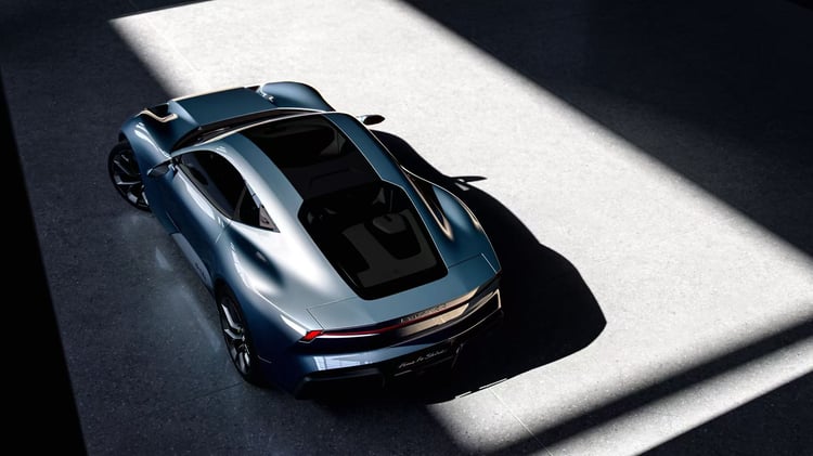 L’habitacle adopte une configuration 2+2, avec une présentation centrée sur le conducteur. Le concept se distingue aussi par un bouton « + » sur la console centrale. Une fois activé, il abaisse la suspension de 15 mm, déploie plusieurs éléments aérodynamiques et fait sortir un aileron arrière. Les écrans peuvent même se rétracter afin de limiter les distractions…