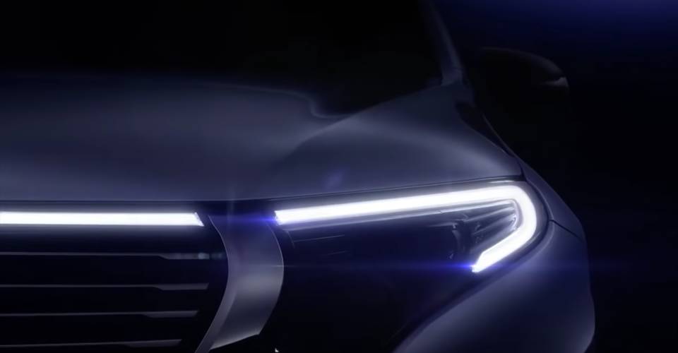 Si l’EQC a déjà été vu à de multiples reprises en version camouflée, c’est la première fois que Mercedes révèle un aperçu du design définitif de son futur SUV électrique, Se limitant à la face avant du véhicule, le teaser laisse notamment entrevoir l’imposante signature lumineuse du modèle. Tranchant avec celle des autres modèles de la marque, celle-ci semble s’étendre sur toute la largeur de la calandre.