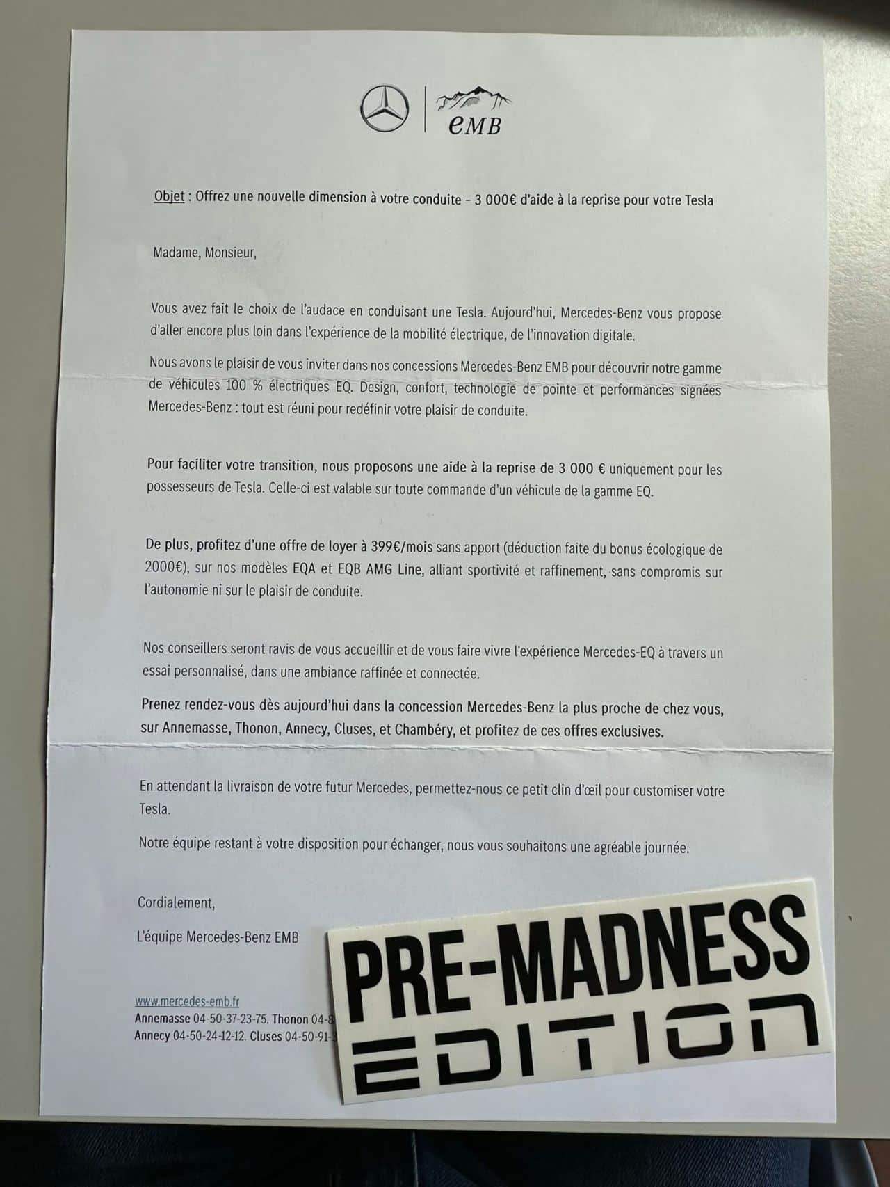 Plusieurs propriétaires de Tesla ont reçu un courrier étonnant dans leur boîte aux lettres ces derniers jours. À Annecy, certains d’entre-eux ont eu une missive de Mercedes accompagnée d’un message pour le moins original. « Vous avez fait le choix de l’audace en conduisant une Tesla. Aujourd’hui, Mercedes-Benz vous propose d’aller encore plus loin dans l’expérience de la mobilité électrique et de l’innovation digitale ».