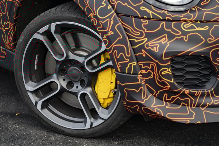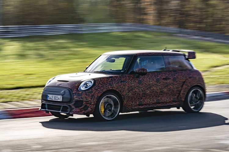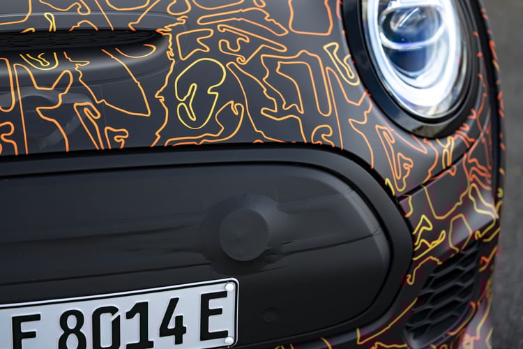 Le constructeur ne dévoile pas encore son modèle de série. Mini ne présente qu’un prototype camouflé, arpentant le circuit du Nürburgring. On y retrouve les ailerons et bas de caisses exagérés, ainsi que le badge « E » dans la calandre pleine.