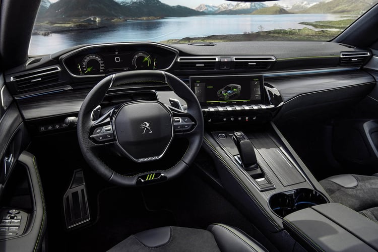 La berline sportive propose aussi un couple de 520 Nm envoyé aux quatre roues grâce à la présence d’un moteur électrique sur le train arrière. Elle promet un 0-100 km/h en 5,2 secondes (on est loin des 4,5 secondes envisagés) pour une vitesse maximale de 250 km/h. Le châssis a également été repensé avec notamment une assiette abaisse de 4 mm, des voies élargies de 24 mm et de 12 mm, des amortisseurs adaptatifs recalibrés et un système de freinage hérité de la 308 GTI. Ces derniers étant plus que nécessaire pour ralentir les plus de 1.900 kg de la berline en ordre de marche !