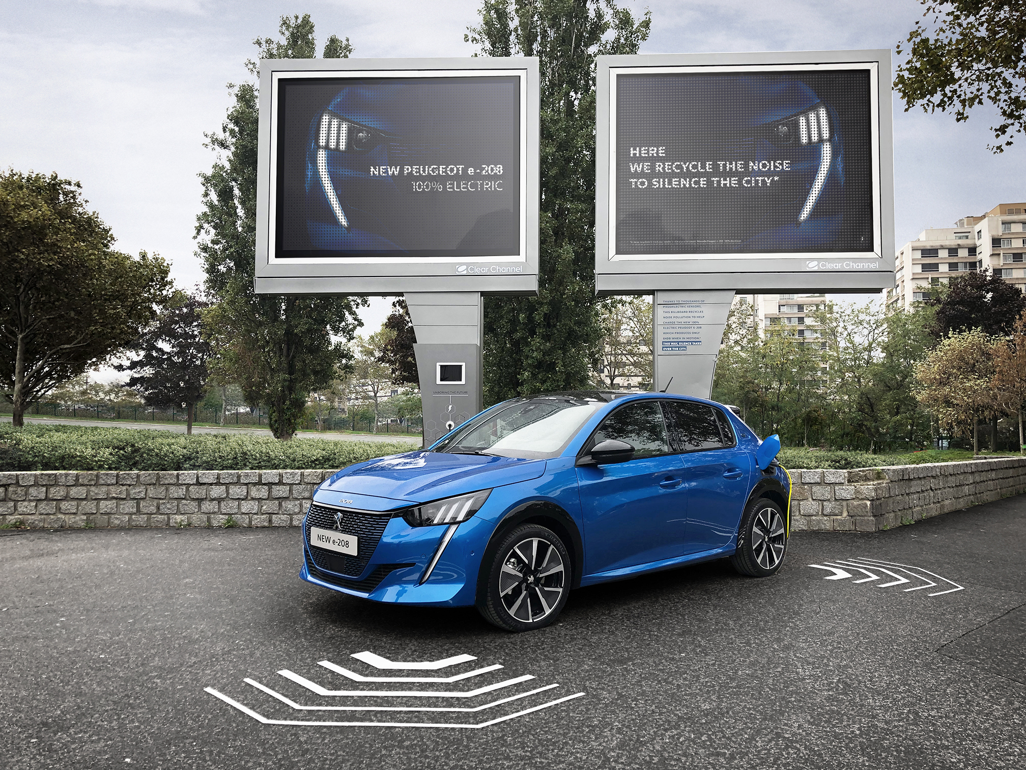 Deux panneaux publicitaires assez particuliers étaient testés fin octobre sur la Porte Maillot à Paris. Installés par Peugeot pour la promotion de la e-208, ils étaient constellés de capteurs piézoélectriques pouvant convertir le bruit en électricité. Au pied, un connecteur permettait la recharge d’une voiture électrique. « Bien entendu, nous ne pouvons pas recharger l’intégralité du véhicule, nous avons encore besoin du réseau urbain, mais il s’agit d’une technologie prometteuse qui n’en est qu’à ses débuts. » explique Thierry Lonziano, le directeur Marketing et Communication de Peugeot.