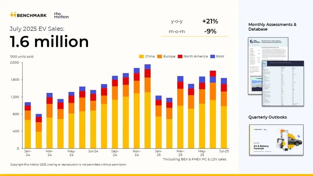 Après un printemps marqué par des volumes records, le marché mondial des voitures électrifiées a légèrement ralenti en juillet. Selon les chiffres de Rho Motion, 1,6 million d’unités se sont vendues sur le mois. Cela représente une hausse de 21 % par rapport à juillet 2024, mais un recul de 9 % si on compare avec juin 2025.