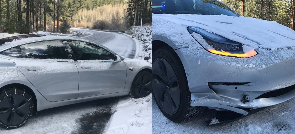 Postées sur une Instagram par un propriétaire sous le pseudo « Model3guy », les images ci-dessous montrent une Model 3 encastrée sur le bas-côté après une vraisemblable perte de contrôle sous une route enneigée malgré le port de chaînes.