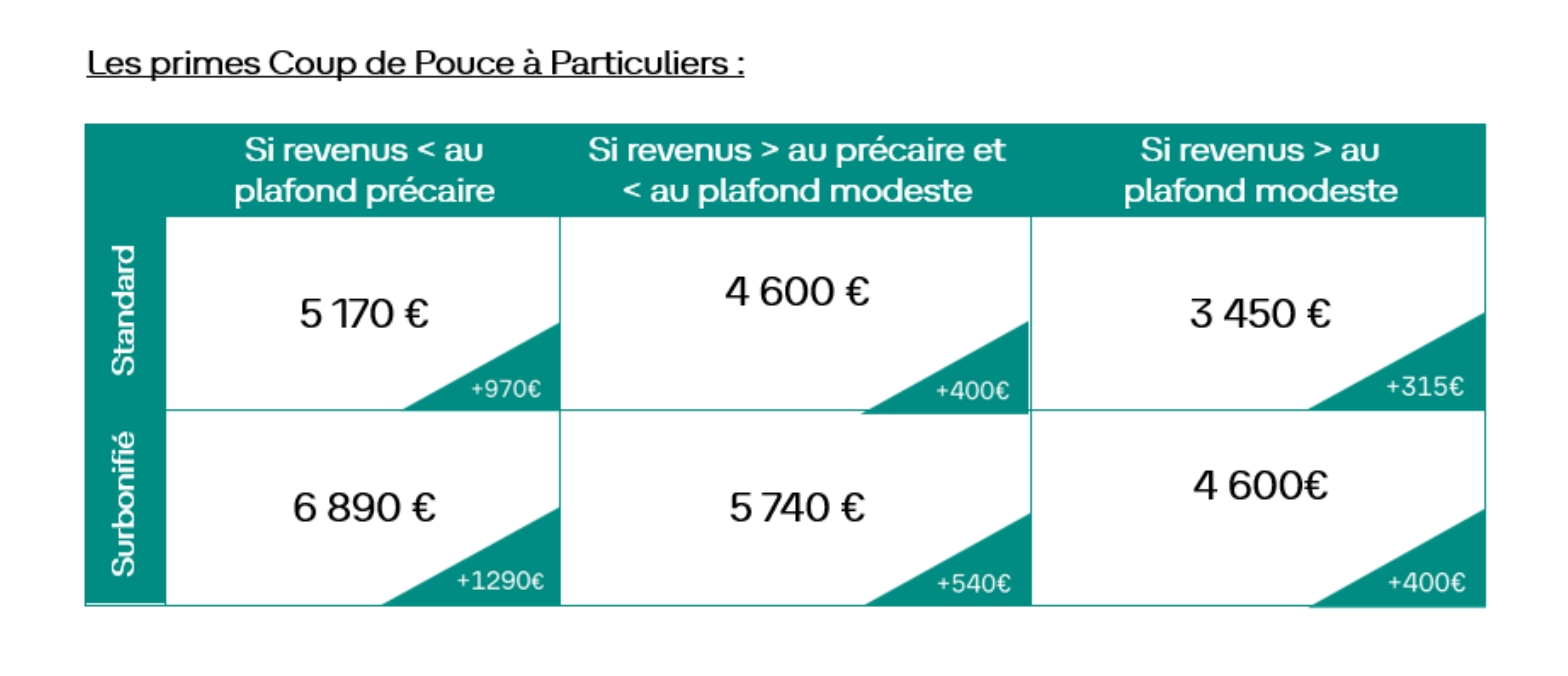 Le Coup de Pouce standard concerne les véhicules « éco-scorés », avec un prix inférieur à 47 000 euros TTC et dont le poids est au maximum de 2,4 tonnes. Il varie désormais de 3 450 à 5 170 €, soit des gains de 315 à 970 €.