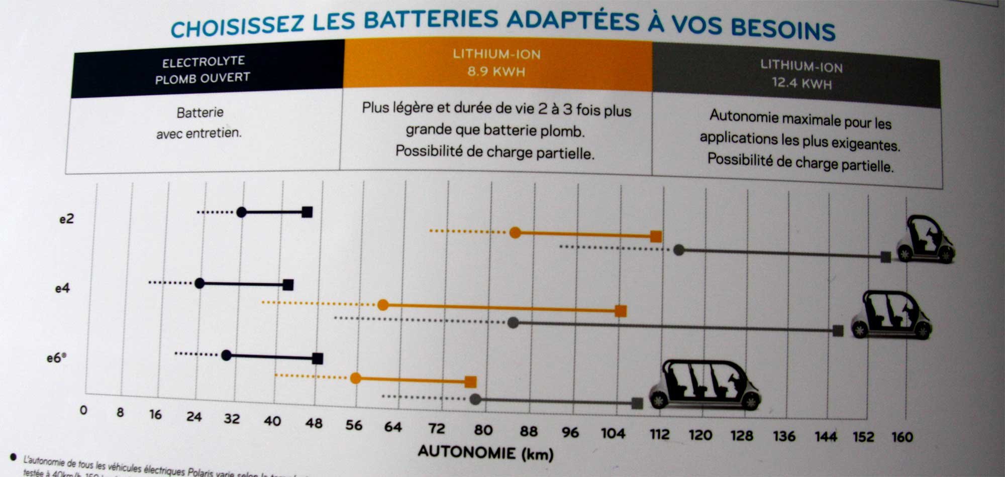Côté moteur, la puissance va de 5 kW pour les versions deux et quatre places à 6.2 kW pour le six places. Dans tous les cas, la vitesse de pointe reste bridée à 40 km/h.