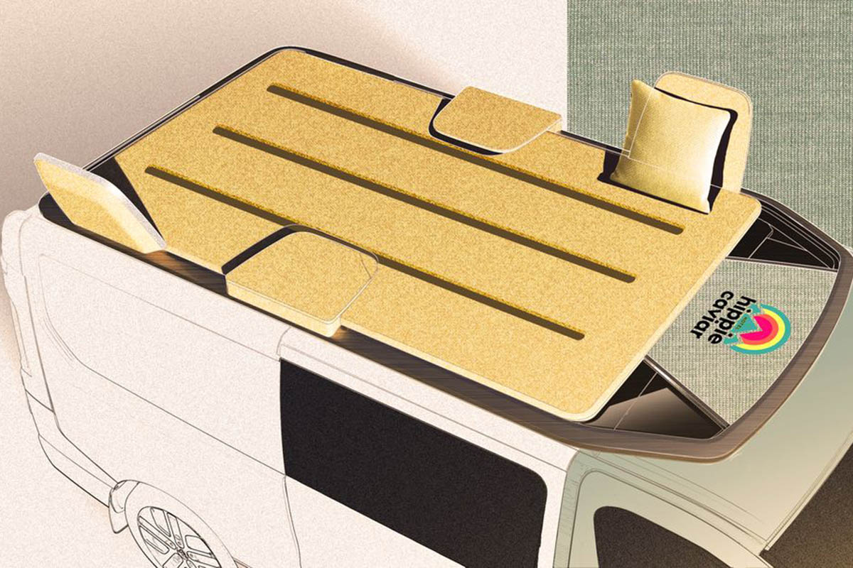C’est à l’intérieur que la plupart des modifications ont été apportées, avec une ambiance qui veut reprendre celle des hôtels 5 étoiles, mais avec des choix de matières et couleurs délicieusement seventies. À l’arrière, la banquette peut se transformer en lit 145×195 cm, lui-même monté sur un rail pour être transporté à l’extérieur. Le couchage peut être secondé par une terrasse sur le toit pour des nuits à la belle étoile.