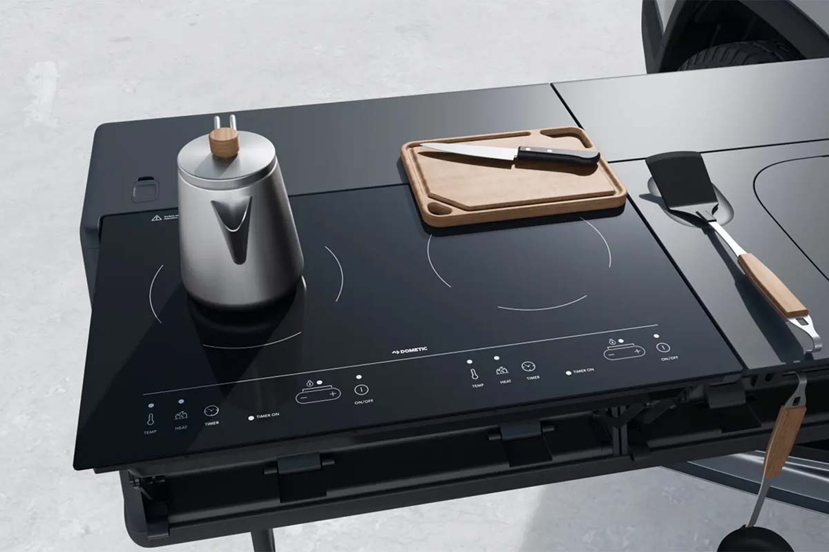 Posée sur le Gear Tunnel qui permet de faire coulisser l’ensemble dans son rangement, cette cuisine est dotée d’une plaque de cuisson à induction à deux brûleurs d’une puissance de 1 440 w et d’un évier alimenté par un réservoir d’eau de 15 l. Elle s’accompagne de l’option Snow Peak qui comprend un ensemble de 30 pièces dans des tiroirs.