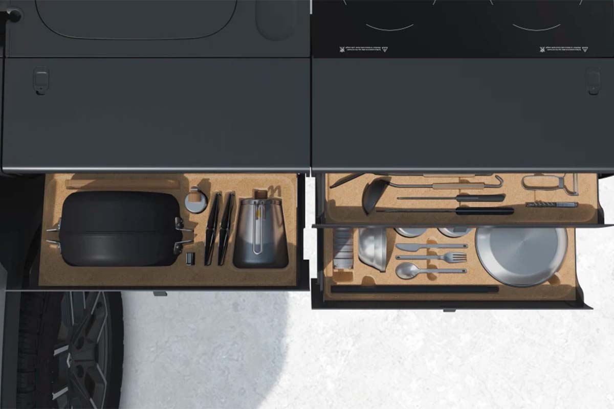 Grâce à sa technologie électrique, le Rivian R1T peut embarquer une cuisine équipée pour un bivouac en toute tranquillité.