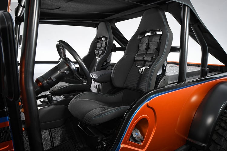 Voilà qui permettra à ce CJ de conserver ses aptitudes au franchissement, comme ses boucliers de Wrangler rabotés, ses pneus à crampons ou son treuil Warn le laissent supposer. Cette création restera à l’état de show-car. Mais elle veut avant tout montrer tout le potentiel de la préparation électrique, et sans nul doute la prochaine gamme de Crate Engine électriques, ces moteurs vendus dans des caisses et prêts à être installés n’importe où.