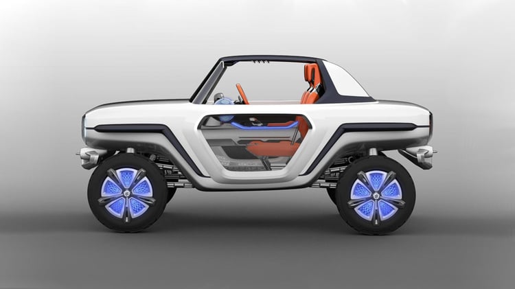 Haut perché, ce concept tout-terrain est doté de quatre moteurs électriques, soit un pour chaque roue, et prend des allures de petit buggy électrique.