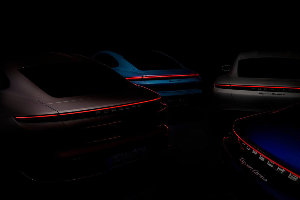Inutile de chercher à éclaircir l’image volontairement assombrie par Porsche. Aucune indication de modèle ne figure sur l’exemplaire le plus à gauche, représenté en beige café métallisé si nos yeux ne nous trompent pas. Responsable R&D pour la marque, Michael Steiner avait révélé en avril 2020 qu’une version d’entrée de gamme de la sportive électrique serait proposée en 2021.