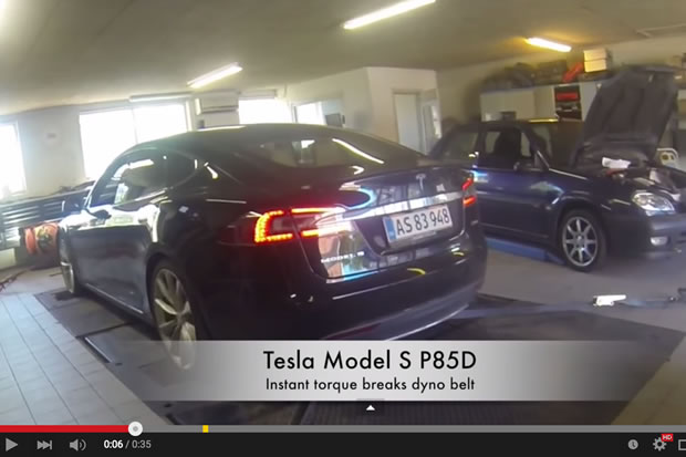 Les 700 ch de la Model S P85D et son mode insane ont bien du mal à passer sur les bancs de puissance, comme en témoigne cette vidéo.