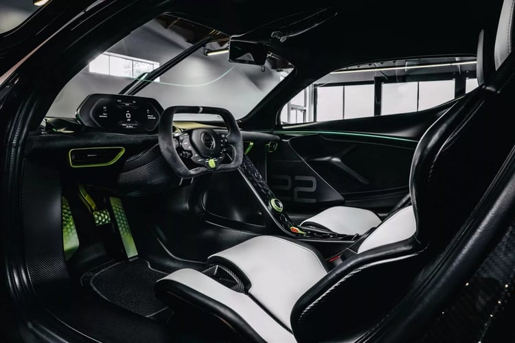 Les étriers de freins arborent aussi une teinte Verve Yellow. À l’intérieur, les sièges en cuir reprennent les deux couleurs principales du véhicule. Les coutures ressortent en jaune pour continuer le même contraste qu’à l’extérieur. On peut aussi apercevoir sur les contreportes le numéro 22, celui de Button en 2009 et entre 2014 et 2017.