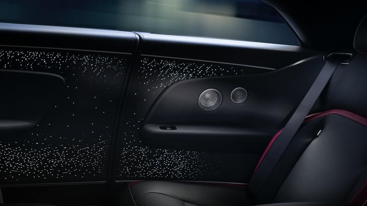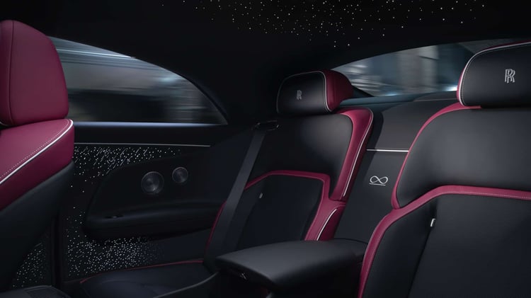 Le logo Infini qui est la signature de la marque se retrouve en divers emplacements à bord, en particulier sur la planche de bord illuminée de 5500 étoiles. La Spectre Black Badge inaugure au passage quelques nouvelles options de personnalisation comme un capot noir laqué ou un nouveau liseré latéral en partie basse.
