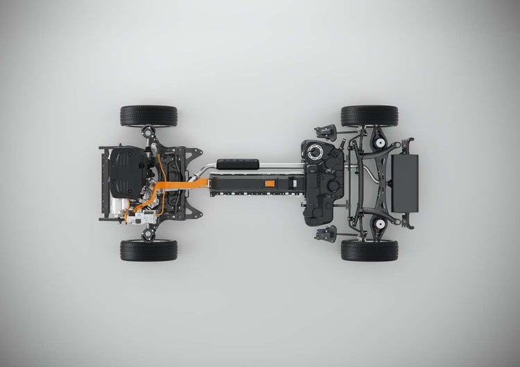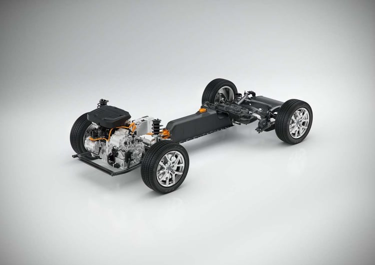 S’il ne nous donne pas beaucoup de détails techniques, Volvo nous présente à quoi ressembleront les architectures électriques et hybrides rechargeables de la plateforme CMA. Sur le tout électrique, la batterie est logée à plat sous le plancher et vient alimenter un bloc moteur monté sur le train avant.