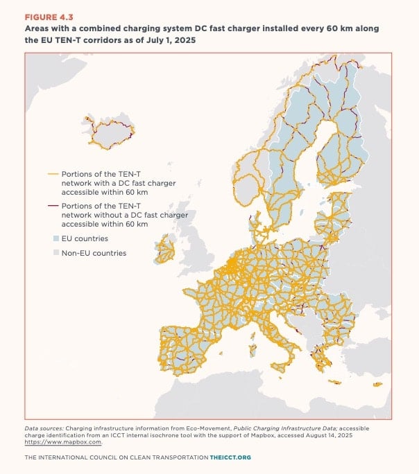 Comme vous pourrez le constater sur cette carte de l’ICCT, les pays de l’Europe de l’ouest sont les mieux lotis. La France, l’Allemagne, la Belgique, la Suisse, le Danemark ou encore les Pays-Bas font partie des meilleurs élèves. Au nord, les grands axes sont moins nombreux et certaines portions restent encore dépourvues de chargeurs rapides.