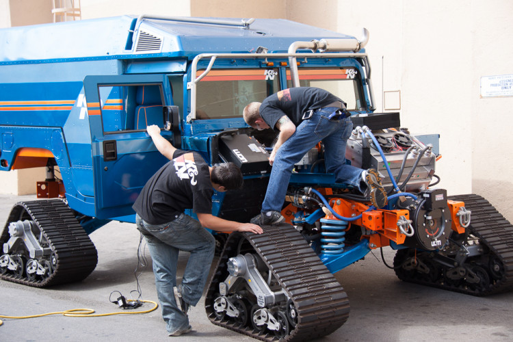 Monté sur chenilles et capable d’embarquer deux passagers, le véhicule a un look carrément imposant. Sur le plan technique, il est animé par deux moteurs électriques UQM de 150 kW associés à un « range extender » de 160 kW. Similaire à celle d’une Leaf, la batterie dispose d’une capacité de 24 kWh. Limité à 70 km/h, le véhicule dispose d’une autonomie électrique de 50 kilomètres environ portée à 1000 km avec l’usage du « range extender ».