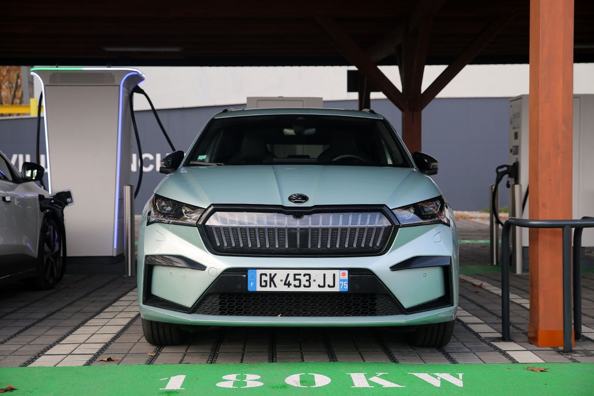 Nous avons utilisé pour l’occasion un Skoda Enyaq iV en version Sportline. Le SUV électrique embarque une batterie de 77 kWh et un chargeur CCS en mesure d’atteindre 135 kW de puissance.
