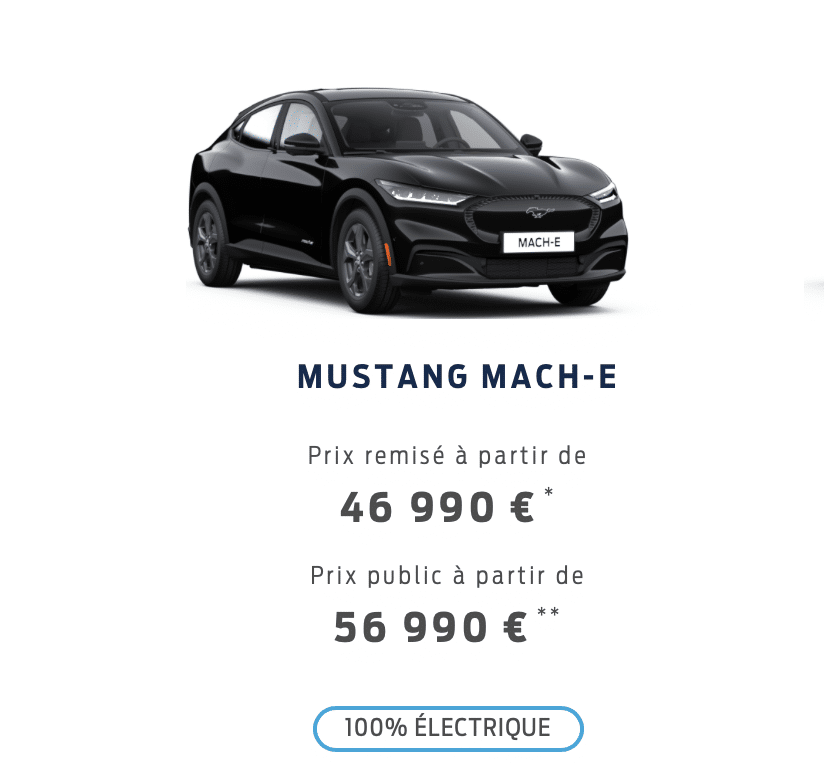 Début 2023, Tesla a lancé une guerre des prix sur le marché de l’électrique. Officiellement, Ford n’a pas eu l’intention d’y répondre. Mais en début d’année, il a baissé le prix de sa Mustang Mach-E. Surtout, depuis quelques semaines, la version de base Propulsion, avec 269 ch et une autonomie de 440 km, a dans le configurateur un prix remisé de 46.990 € au lieu de 56.990 €. Cette offre permet à la voiture d’avoir droit au bonus de 5.000 €. L’offre est annoncée sous conditions de reprise, mais à vous de bien négocier ce tarif… en faisant donc jouer la concurrence Tesla.