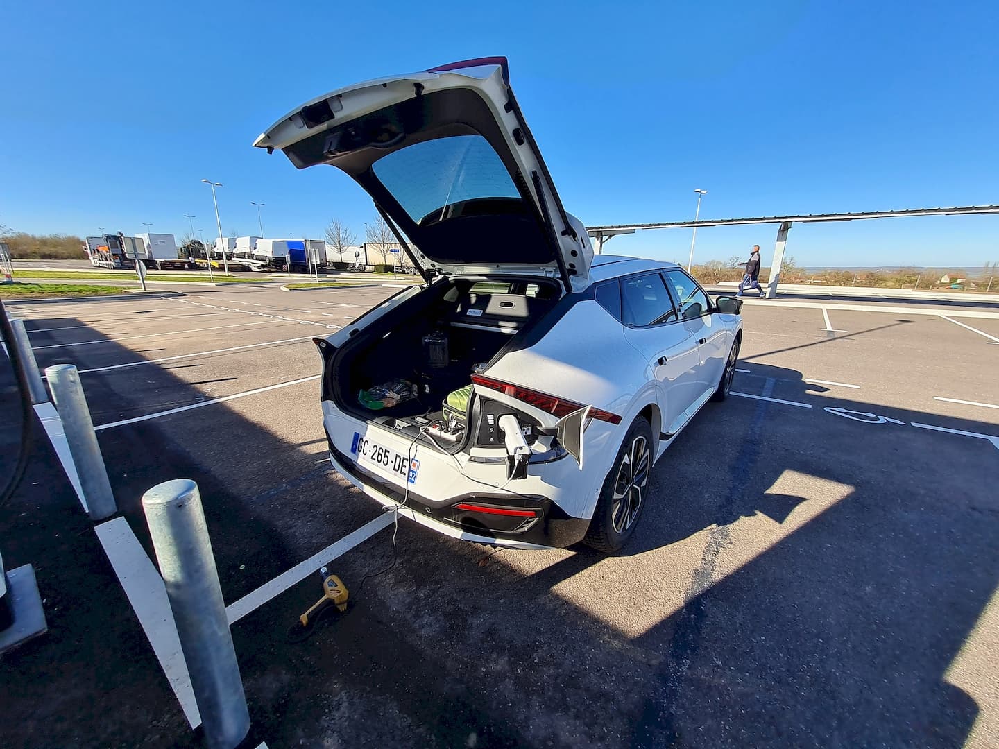 À l’occasion de notre troisième et ultime arrêt-recharge, sur la station Ionity de l’aire de Maison-Dieu, nous testons la fonction « V2L ». Vendue 500 € en option sur le Kia EV6, le « Vehicule-To-Load » permet d’alimenter n’importe quel appareil électrique à partir de la batterie de traction. Sur l’EV6, le système peut délivrer jusqu’à 3,7 kW de puissance. C’est suffisant pour faire fonctionner nos trois appareils : un toaster à paninis de 700 W, un chauffage soufflant de 2 000 W et un pistolet thermique de 1 000 à 2 000 W. Sachez qu’il est également possible de recharger une autre voiture électrique via le V2L, pour un dépannage d’urgence par exemple.