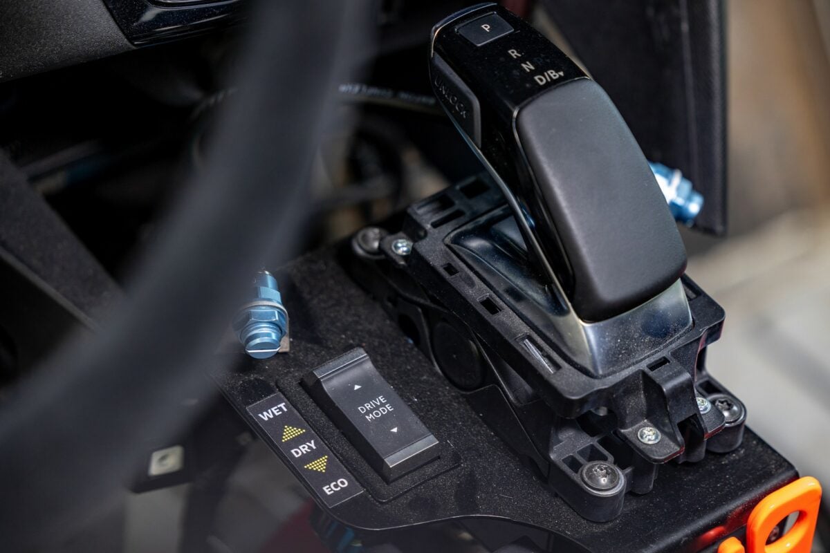Celle-ci est équipée d’un frein à main hydraulique, ce qui parait forcément étrange dans une voiture électrique. Mais le pilote nous a expliqué que la voiture en avait besoin dans les sorties de longues courbes ou d’épingles. Puisqu’il s’agit d’une traction, elle a tendance à sous-virer, et le frein à main permet de corriger ce trait de caractère.