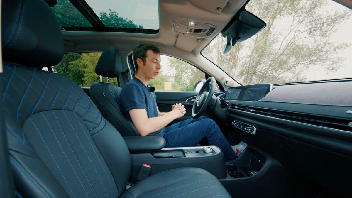 Comme sur la Smart #1, le siège du conducteur recule à l’ouverture de sa porte pour lui faciliter l’accès à bord ou ressortir de la Ora Funky Cat. Max Freyss apprécie : « C’est épuré. Il y a des boutons juste ce qu’il faut. Les matériaux donnent une vraie impression de premium, comme ce sélecteur de vitesse : on se croirait chez BMW avec ces incrustations cristaux. Beaucoup de cuir et de tissu qui se marient extrêmement bien. La planche de bord est rembourrée ».