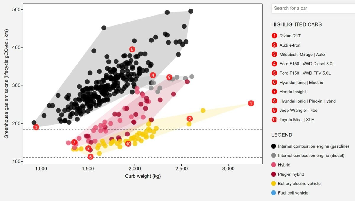 Nouveau malus au poids : tout ce qu’il faut savoirOn voit aussi que parmi les voitures à essence incluses dans l’étude, une Mazda MX-5 ou une berline thermique comme la Nissan Sentra émettent moins de CO2 sur l’ensemble de leur vie qu’un Rivian R1T. Mais on voit aussi qu’un SUV de grand gabarit, tel que le Honda CR-V, reste aussi moins polluant que le pick-up électrique.